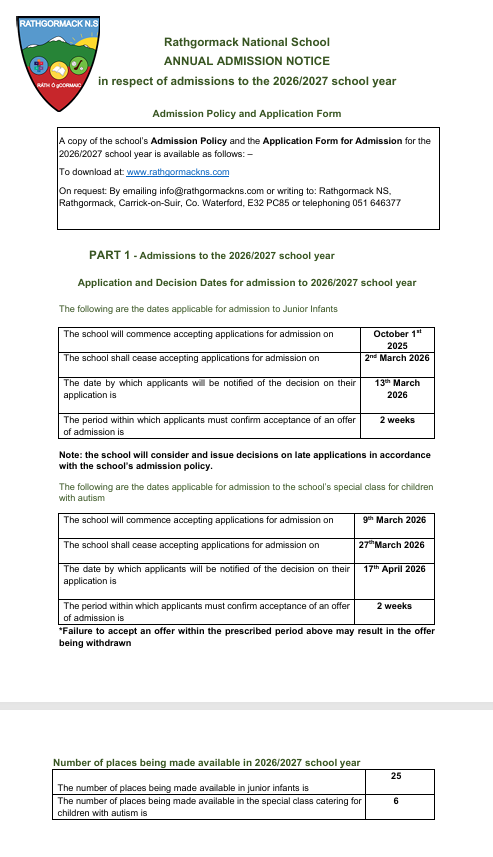 Rathgormack admissions Notice 2025